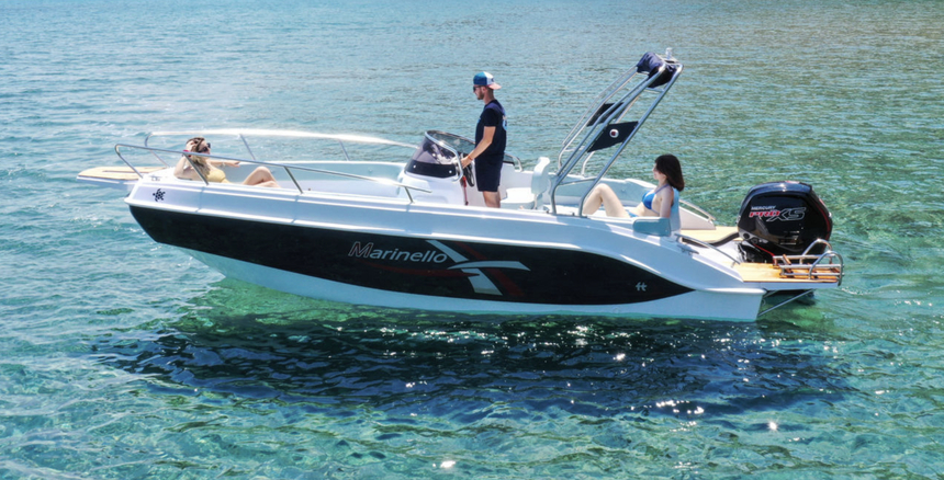 trailerbares offenes Sportboot mit Seitensteuerstand, 2 großen Sonnenliegen, mit max. Motorisierung 350 PS, großen Sonnenliegen, Tisch , Badeplattformen, Sonnendach