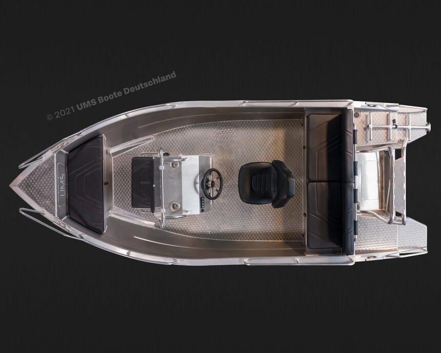 Voll verschweißter Aluminiumrumpf Abschliessbares Bug Staufach Abschliessbare Sitzbank / Staubox Centerkonsole mit Windschutzscheibe Teleflex Lenkung Navigationsbeleuchtung Batteriekasten / Batteriehauptschalter / Schaltpanel Elektrische Bilgenpumpe massive Aluminium Reling und Klampen