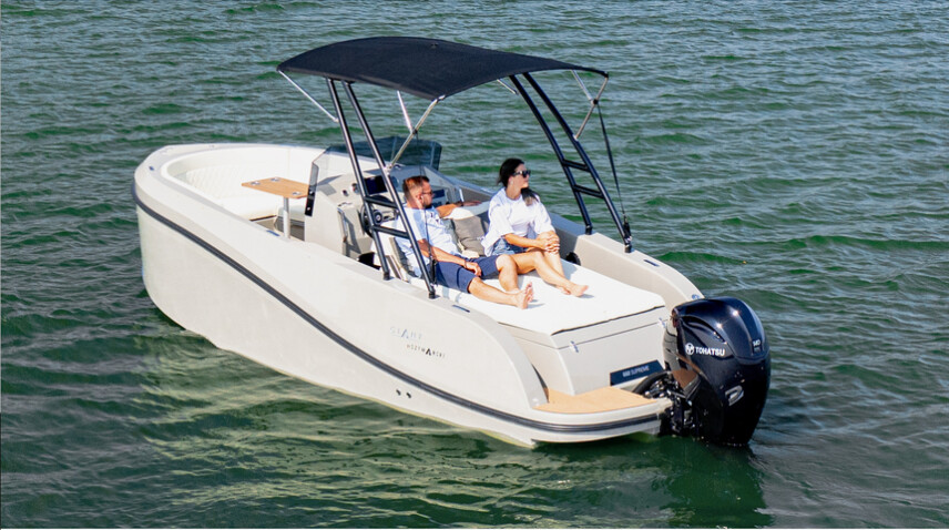 Das Giant 660 Supreme kombiniert sportliche Performance mit erstklassigem Fahrkomfort. Dank seiner durchdachten Bauweise ermöglicht es einen nahtlosen Übergang zwischen Bug und Heck. Die stabile Konstruktion sorgt für sichere und dynamische Fahreigenschaften auf dem Wasser. Für maximalen Komfort bietet das Boot hochwertige Relings, eine verstellbare Rückenlehne für den Steuermann, die sich in eine Sonnenliege verwandeln lässt, sowie eine vielseitige Steuerkonsole, die sowohl im Sitzen als auch im Stehen genutzt werden kann. Zahlreiche Staufächer bieten Platz für Equipment, während das großzügige Sonnendeck mit Tischhalterung zum Entspannen einlädt. Eine ausziehbare Badeleiter erleichtert den Zugang zum Wasser. Zur Standardausstattung gehören selbstlenzende Decks, versenkbare Klampen und eine robuste Edelstahl-Festmacheröse – perfekt für unvergessliche Tage auf dem Wasser.